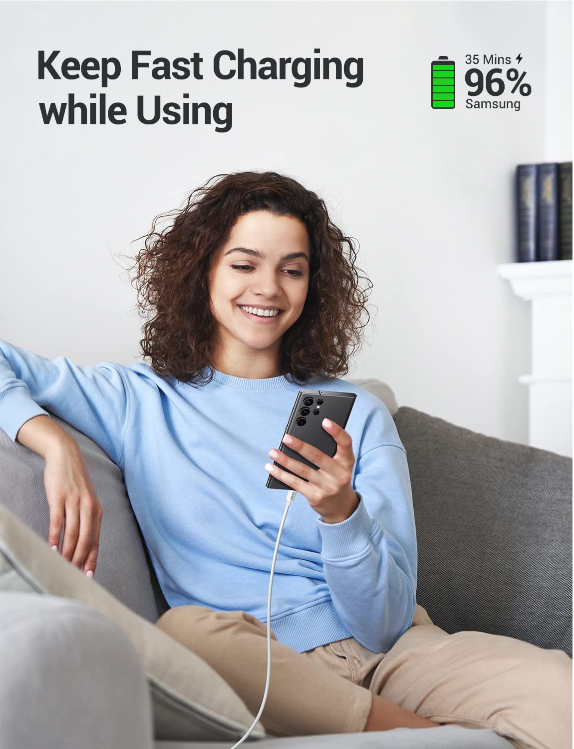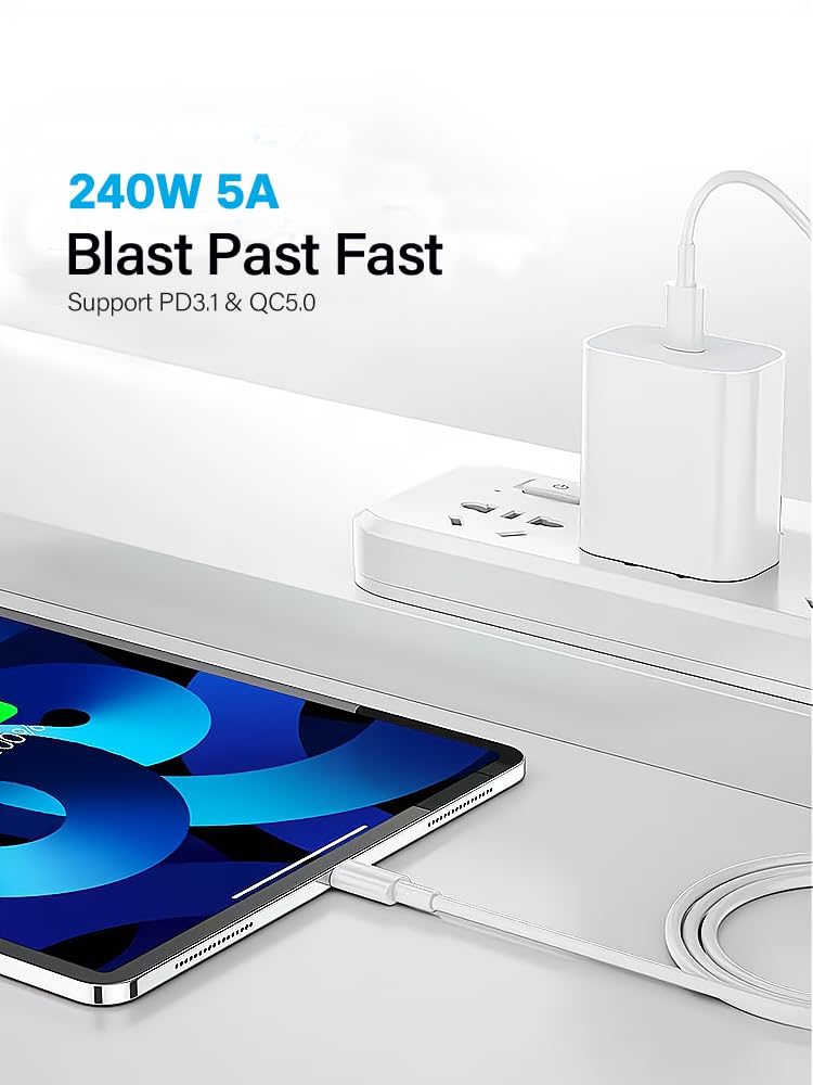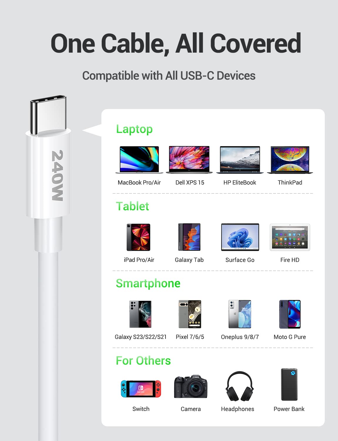 “TIME-SAVING USB-C CABLE”: This USB PD 3.1 Type C to Type C cable can charge your device at the fastest speed possible. It can fully charge a MacBook Pro up to 86%, an iPad Pro up to 89%, a Samsung S21 up to 96%, and a Switch up to 90% in just 35 minutes! Faster and more powerful than 100W USB C cable and 60W USB C cable. This USB-C fast charging cable is compatible with 240W/ 200W/ 180W/ 140W/ 100W/ 60W/ 45W/ 18W Power Delivery.